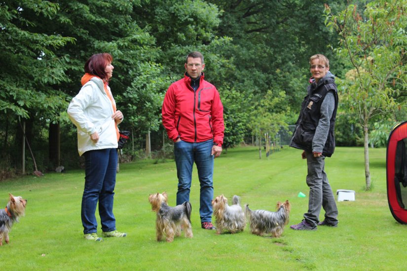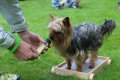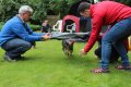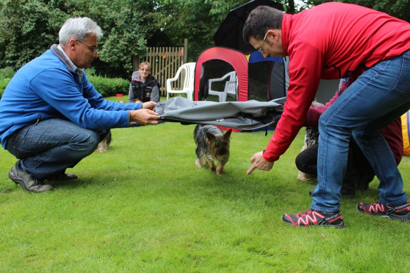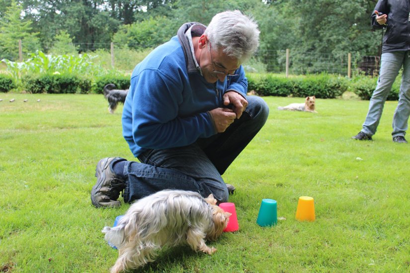 Brego umrundet die mit Leckerli versehenen Hütchen