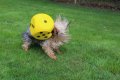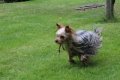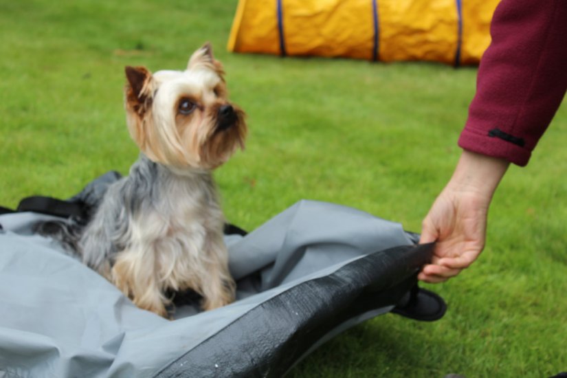 Frenzi läßt sich auf dem Rollwagen ziehen