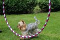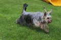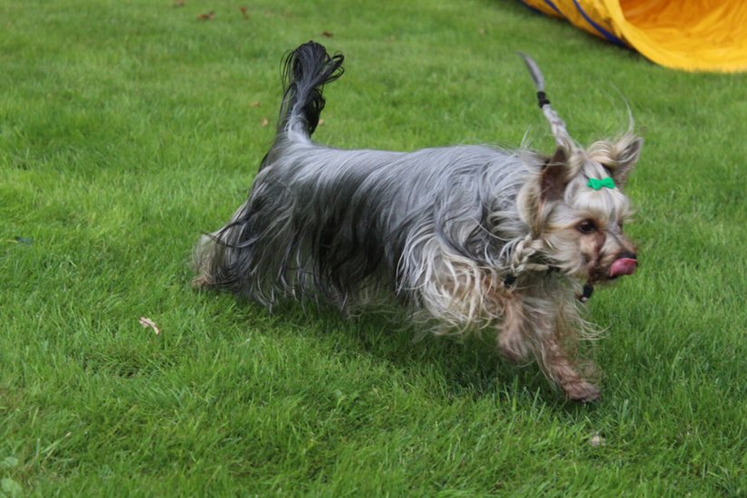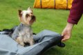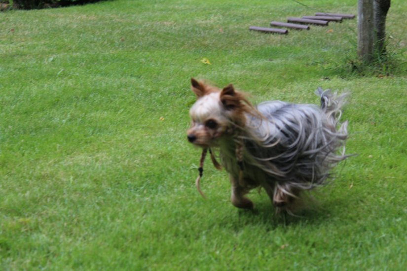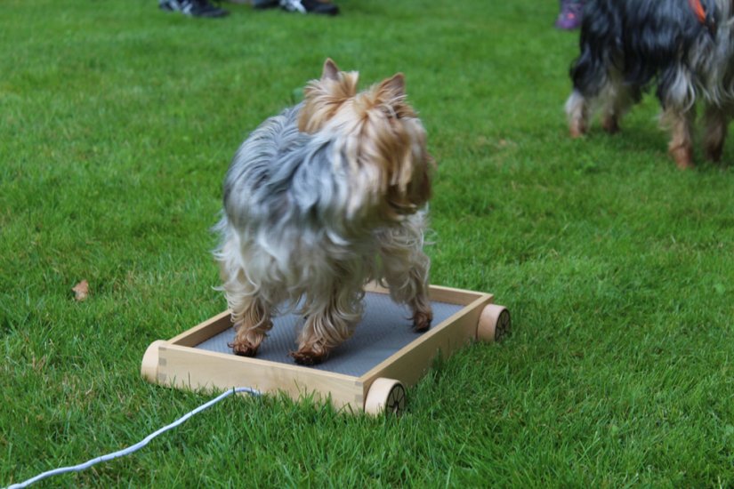 Frenzi läßt sich auf dem Rollwagen ziehen