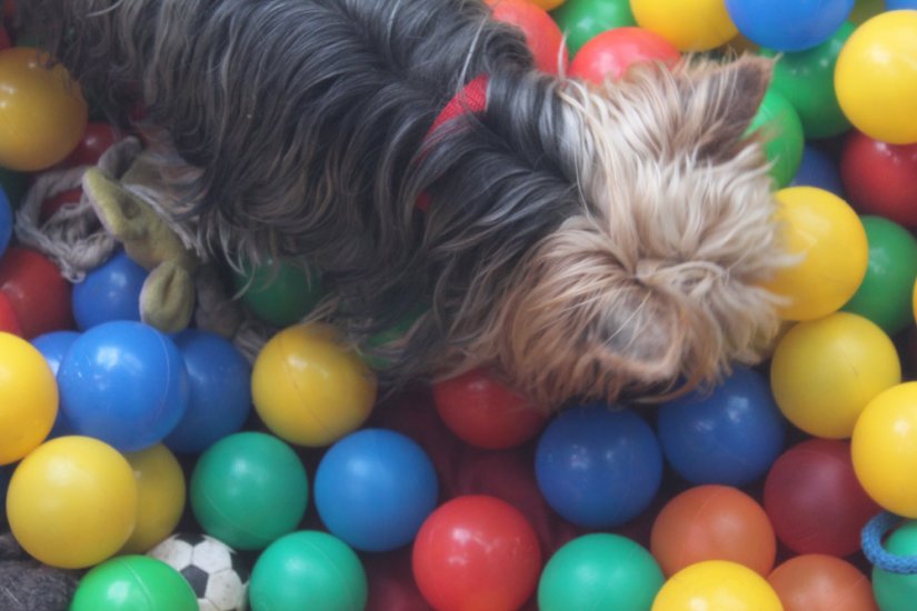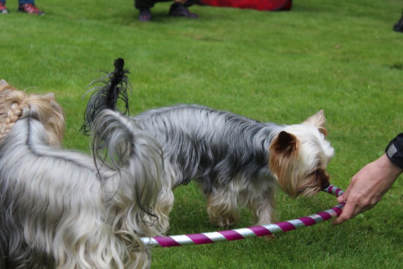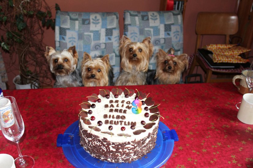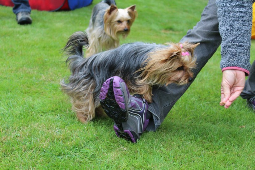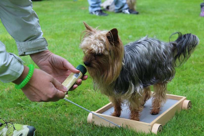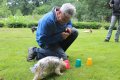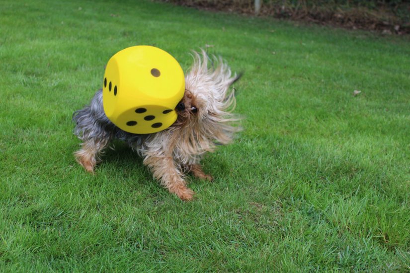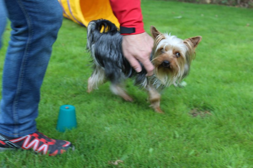 Brego umrundet die mit Leckerli versehenen Hütchen