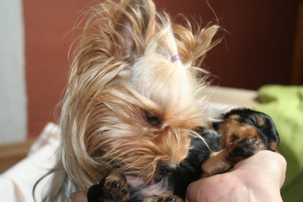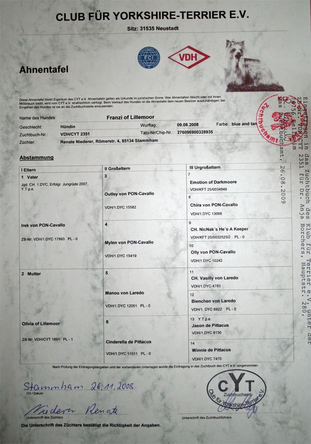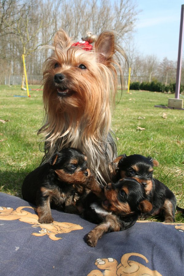 Franzi ist eine ganz liebevolle Mama und hat die Chipie's charming Zucht begründet und 10 wundervollen Yorkies das Leben geschenkt.Leider mußte der kleine Carn-Dûm mit 10 Tagen eingeschläfert werden- was für uns alle sehr schrecklich war. Franzi hat in drei Würfen mit insgesamt 9 Welpen ausschließlich PL-0 Hunde hervorgebracht-ein schönes Resumée...